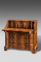 Elegante escrivaninha, totalmente folheada em madeira de nogueira e raiz de nogueira.