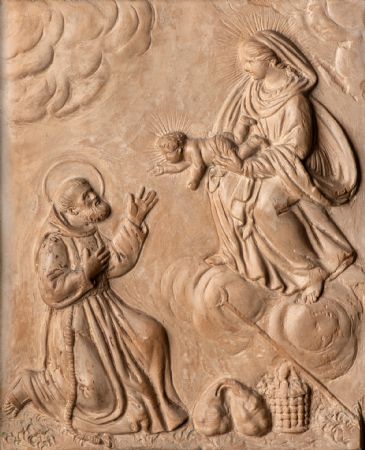 Placa devocional de terracota que representa "La Virgen ofreciendo al niño a un santo". 31 x 26 cm Firmado y fechado en la parte posterior "Ímola, Giuseppe .... 1860"